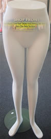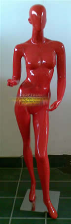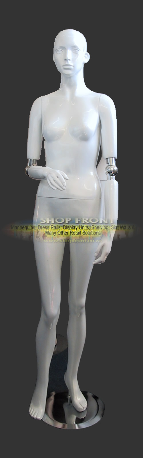 The mannequin is plastic on a glass base, the base attaches to the calf therefore allowing the mannequin to wear shoes. Arms can rotate 180 degrees and the head sits on a shaft that allows it to rotate to change the direction the mannequin is looking. By altering these mannequins you can use them together and make them similarly different